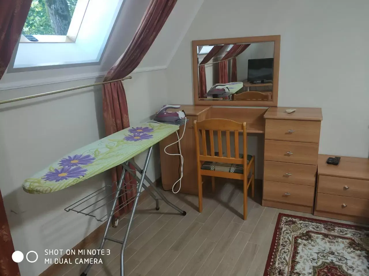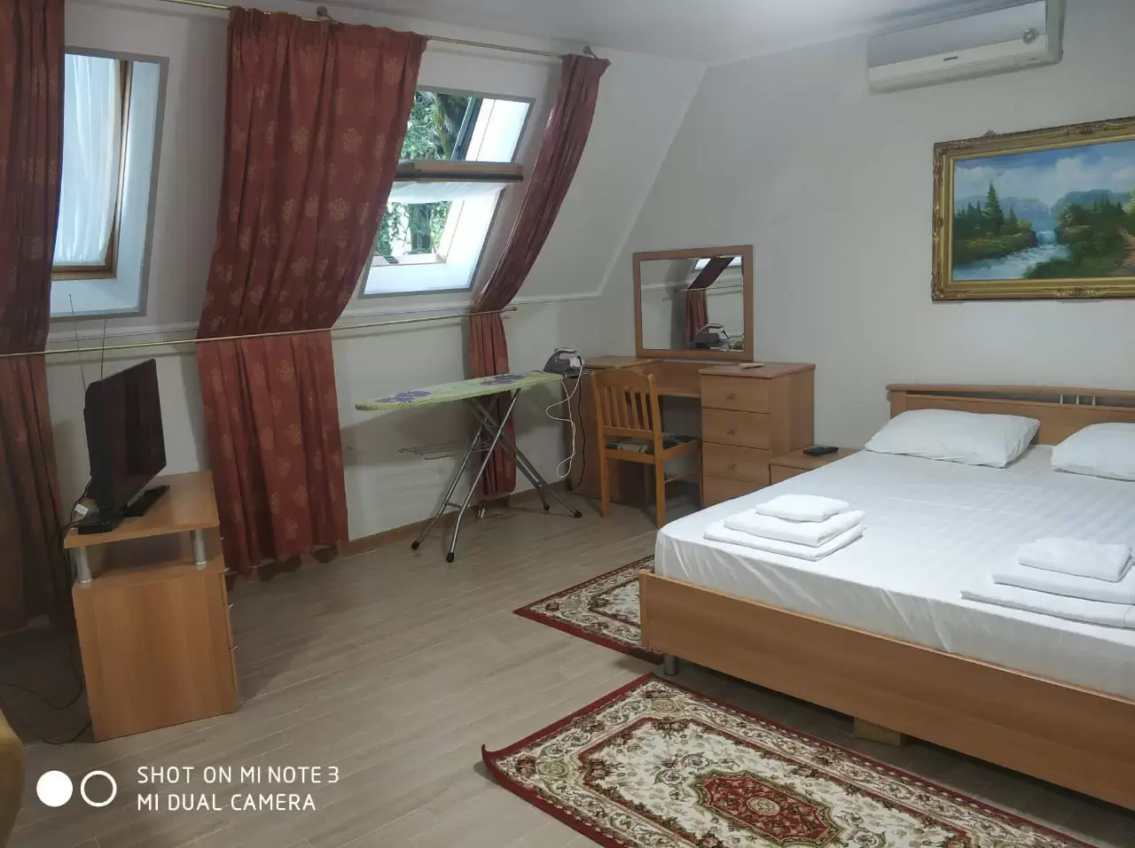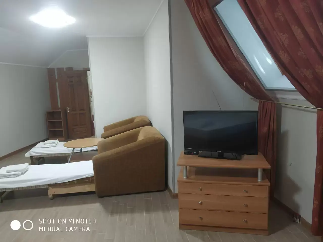 Номер "Люкс" расчитан на проживание до 4-х человек. Просторный номер 36 кв. м. с удобствами оборудован: двуспальной кроватью, раскладной кроватью и шкафом. Имеется ж/к телевизор, сплит, холодильник, санузел с душем.
